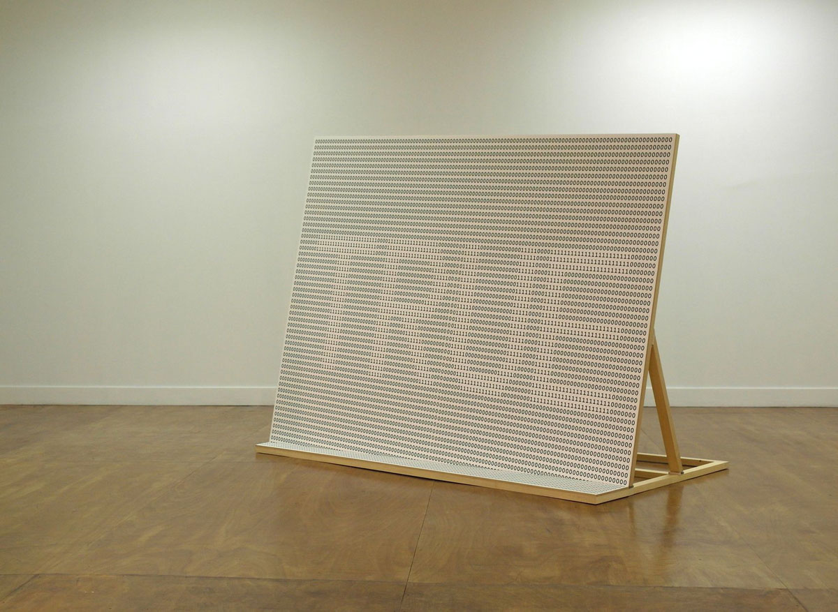 Dans le contexte d’une exposition sur le cinéma, Defragmented core (Cœur défragmenté) est une sculpture écran qui évoque le temps de diffusion. Mais la nature de l’image représentée, TRUE (vrai) qui apparaît sur un fond tramé de 0 et de 1, désigne le langage binaire, propre à la constitution du langage numérique.
